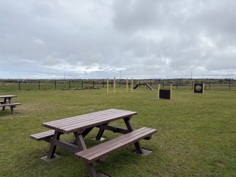 Innan gerðisins eru leiktæki fyrir hunda og bekkir fyrir eigendur þeirra.