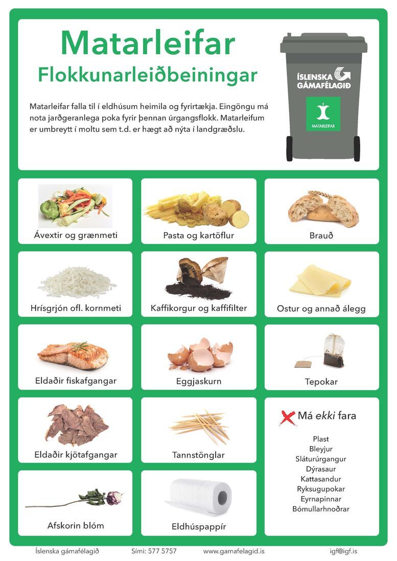 Hér fyrir neðan eru prentvænar leiðbeiningar um flokkun matarleifa af vef Íslenska gámafélagsins.