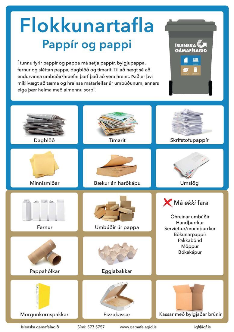 Hér fyrir neðan eru prentvænar leiðbeiningar um flokkun pappírs af vef Íslenska gámafélagsins.