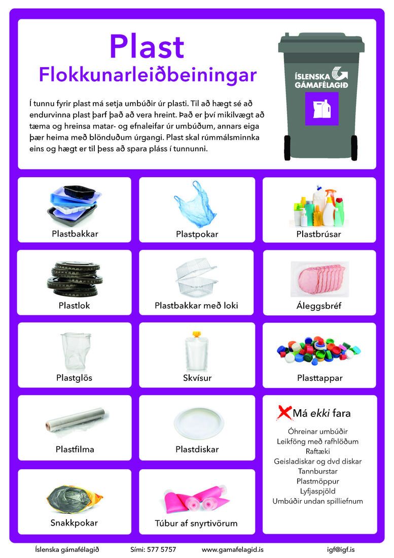 Hér fyrir neðan eru prentvænar leiðbeiningar um flokkun plasts af vef Íslenska gámafélagsins.