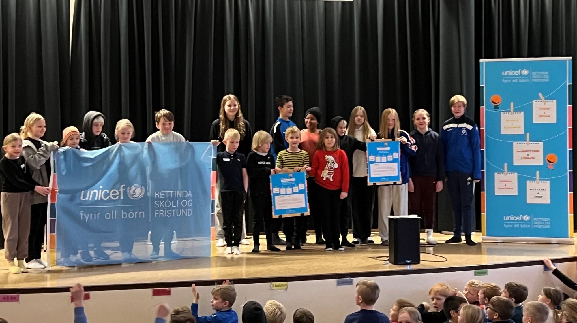 Á viðurkenningarathöfninni kynntu fulltrúar nemenda vinnuna sem fram fór fyrri þemadaginn. Nemendur stóðu sig mjög vel við að lýsa því hvað vinabekkir höfðu unnið og hvernig það tengdist annarri grein barnasáttmálans.