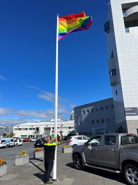 Regnbogafáninn dreginn að húni.