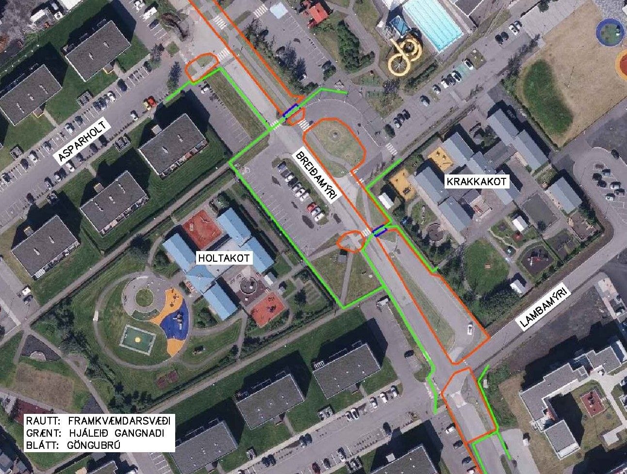 Í ljósi skólasetningar hjá Álftanesskóla viljum við benda sérstaklega á hvar gönguleiðir eru á svæðinu. Á meðfylgjandi korti eru framkvæmdasvæðin sýnd með rauðu, grænt sýnir hjáleiðir og blátt sýnir hvar göngubrúm hefur verið komið fyrir, við Álftaneslaug og Krakkakot.