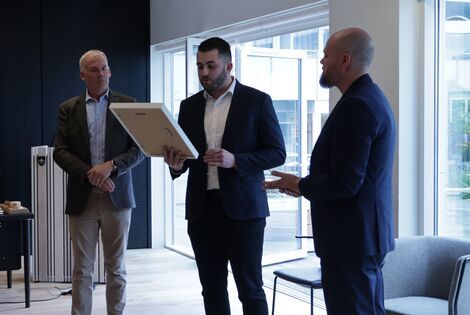 Almar Guðmundsson bæjarstjóri Garðabæjar og Hrannar Bragi Eyjólfsson, formaður íþrótta- og tómstundaráðs Garðabæjar, afhentu Einari Karli Birgissyni, formanni körfuknattleiksdeildar Stjörnunnar, viðurkenninguna.