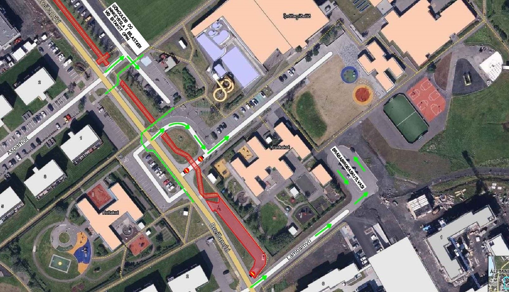 Tímabundin innkeyrsla verður við útkeyrslu skutlvasa við íþróttamiðstöð. Lokað verður fyrir bílastæði við Krakkakot og bráðabirgðaskutlavi færður í botnlanga í Lambamýri.