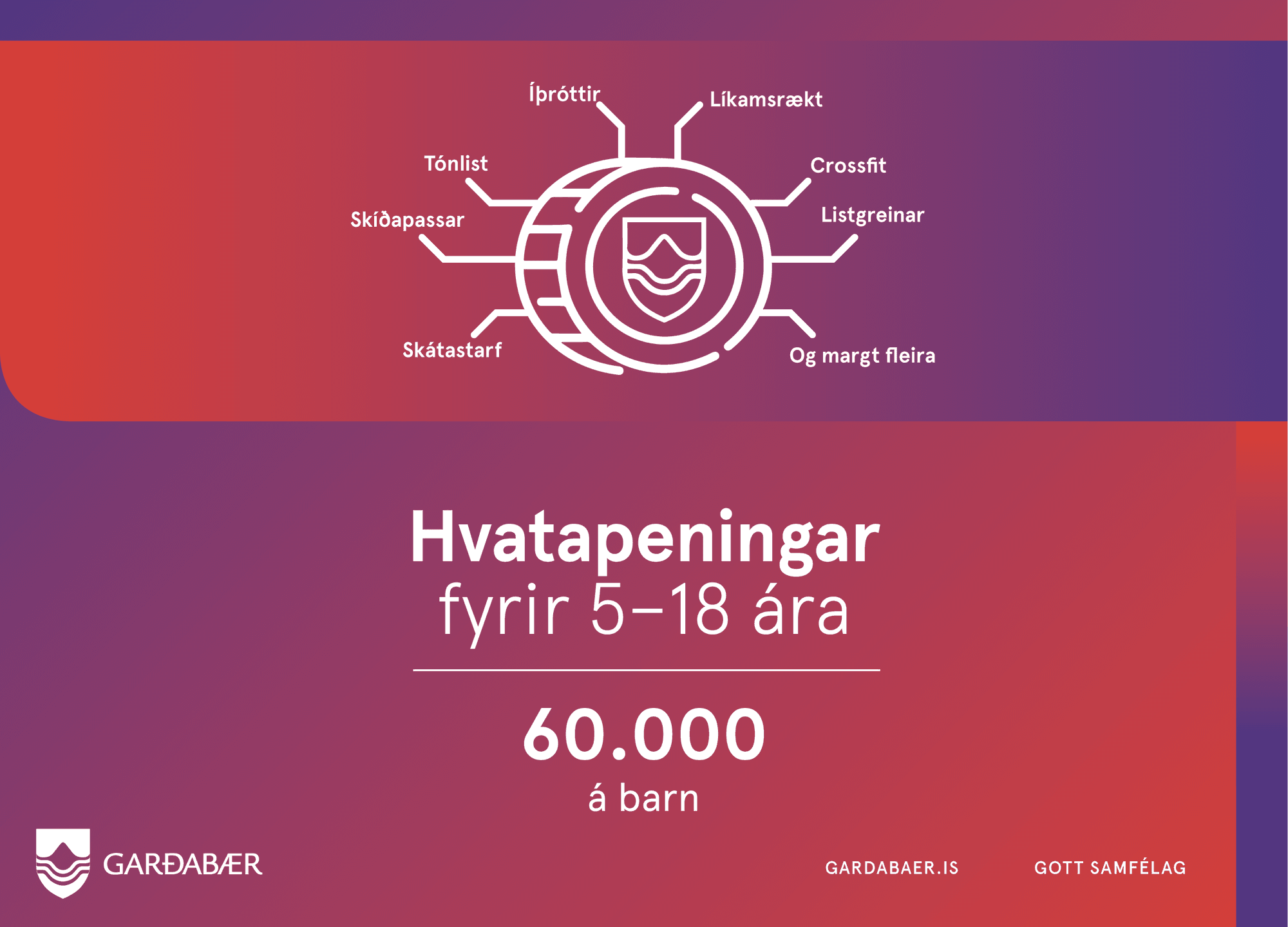 Hvatapeningar ársins 2025 eru 60.000 krónur á barn og þá má nýta til að greiða niður gjöld í skipulögðu íþrótta-, tómstunda- og æskulýðsstarfi sem stundað er reglulega.