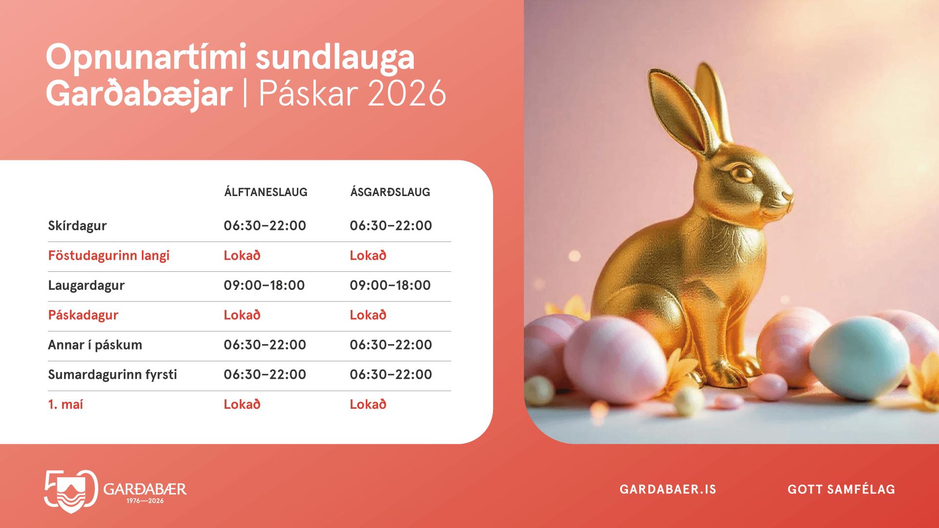 Sundlaugar Garðabæjar eru lokaðar á föstudaginn langa og páskadag, en annars haldast opnunartímar óbreyttir