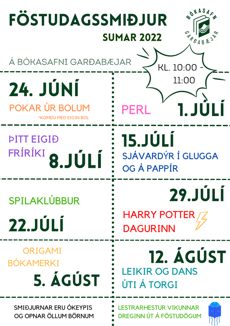 Á Bókasafni Garðabæjar við Garðatorgi verður boðið upp á fjölbreytt starf fyrir börn og ungmenni í sumar.  Á fimmtudögum kl.13 verður boðið upp á sérstakar lista- og sköpunarsmiðjur og á föstudögum eru sumarsmiðjur frá 10-12.