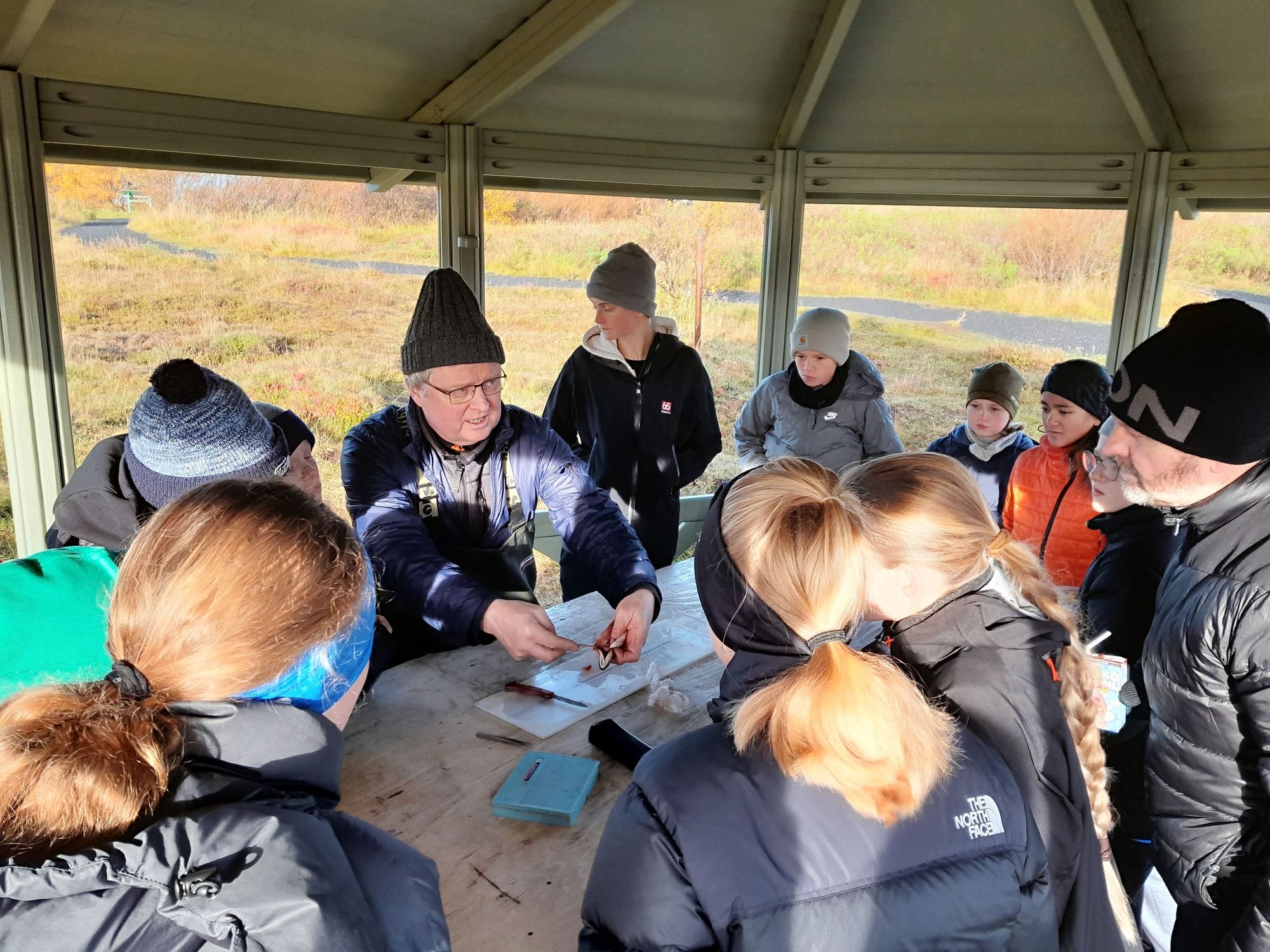 Í lok útikennslunnar krufði Bjarni fisk og sagði frá aldurs- og kyngreiningu, líffræði og lífeðlisfræði fiska. Nemendur fengu síðan smádýrasýni og silung úr vatninu með sér í skólann til nánari rannsókna undir handleiðslu kennara.
