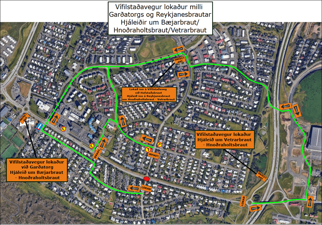 • Hringtorg Vífilsstaðavegar og Karlabrautar: Byrjað verður um klukkan 9:00 og unnið til hádegis. Áætlað er að opna fyrir umferð um klukkan 13:00
