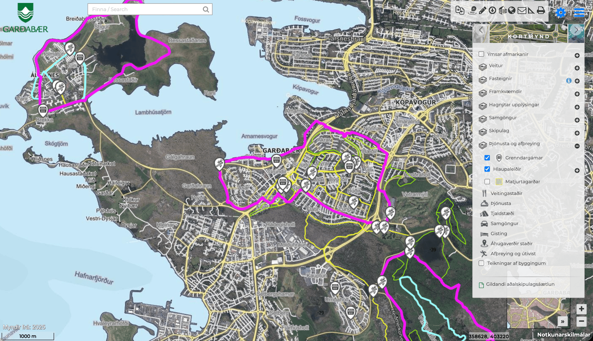 Kortavefur Garðabæjar er tólið þitt til að skoða og skilja Garðabæ. Þú getur auðveldlega leitað að teikningum, lóðarmörkum og fróðleik um nærumhverfið.