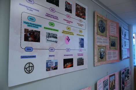 Á Bókasafni Garðabæjar má nú sjá sýningu sem samanstendur af níu stórum veggspjöldum þar sem sagt er frá meðal annars kvenfélögum, baráttunni fyrir kosningarétti, kvennafrídeginum og rauðsokkunum og fyrstu kvenkyns forsetum.
