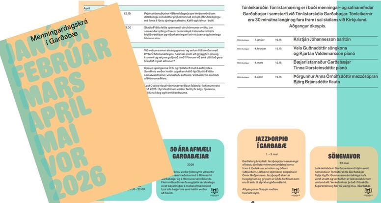 Nýr bæklingur með menningardagskrá fyrir vorið 2026 var borinn út í hús í dag. Hann verður einnig hægt nálgast á bókasafni Garðabæjar, á Hönnunarsafni Íslands á Garðatorgi og í þjónustuveri Garðabæjar.