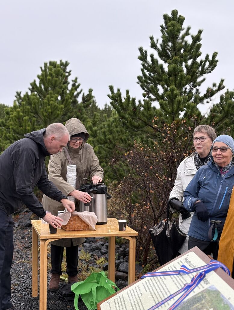 Kvenfélagskonur létu smá rigningu ekki stoppa sig og buðu upp á bakkelsi með kaffinu við afhjúpunina.