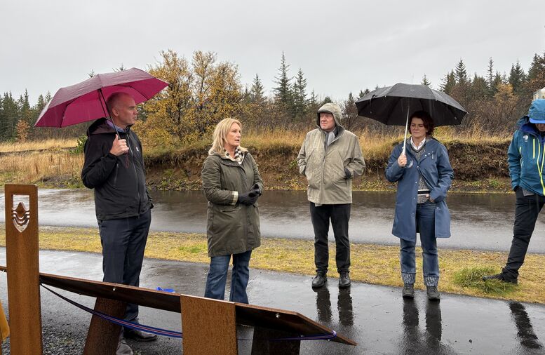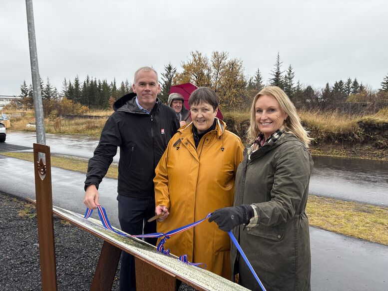 Erla Bil Bjarnardóttir, fyrrverandi garðyrkjustjóri og síðar umhverfisstjóri Garðabæjar, klippti á borðann með aðstoð Almars Guðmundssonar, bæjarstjóra Garðabæjar, og Stellu Stefánsdóttur, formanns umhverfisnefndar.